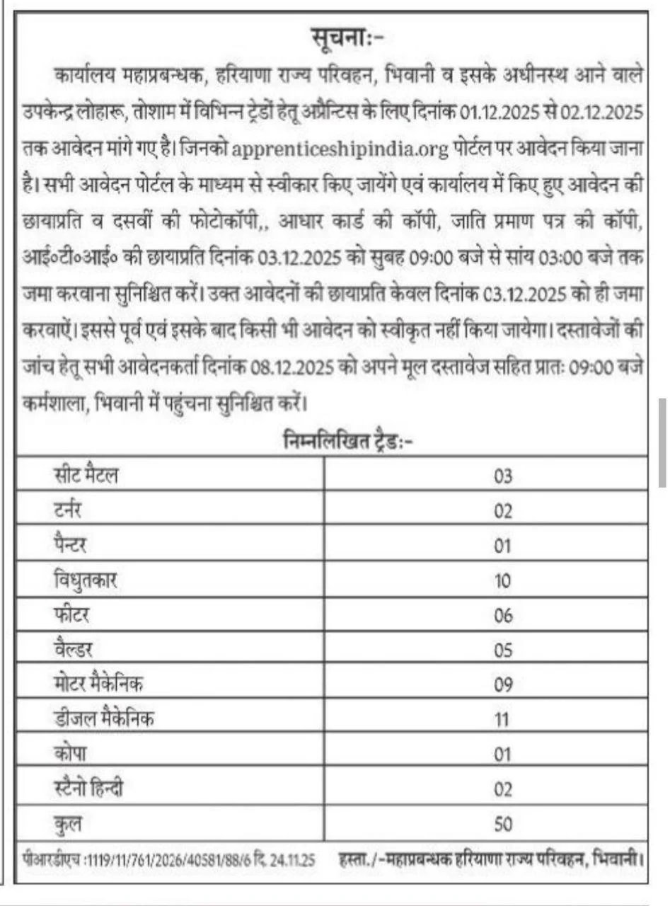 हरियाणा रोडवेज़ भिवानी डिपो ने वर्ष 2025–26 सत्र के लिए आईटीआई पास अभ्यर्थियों से अप्रेंटिस के 50 पदों पर आवेदन आमंत्रित किए हैं। भिवानी रोडवेज़ जनरल मैनेजर की ओर से जारी नोटिफिकेशन के अनुसार उम्मीदवार 1 दिसंबर 2025 से 2 दिसंबर 2025 तक ऑनलाइन आवेदन कर सकते हैं। यह भर्ती पूरी तरह अप्रेंटिसशिप इंडिया पोर्टल के माध्यम से की जाएगी।